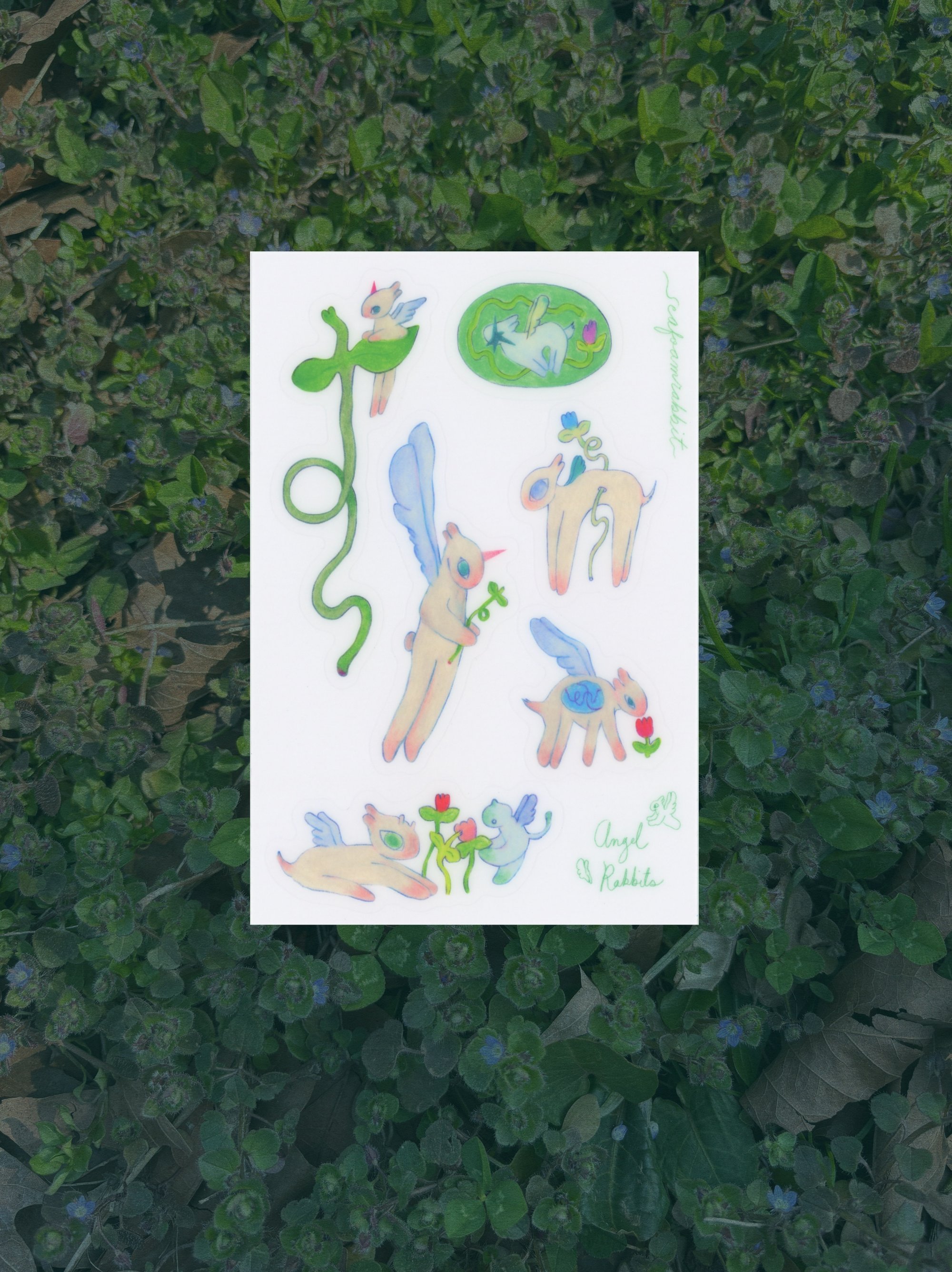 angel rabbit enjoying spring :) This 4 by 6 sticker sheet is frosted (clear but made to look like stained glass)