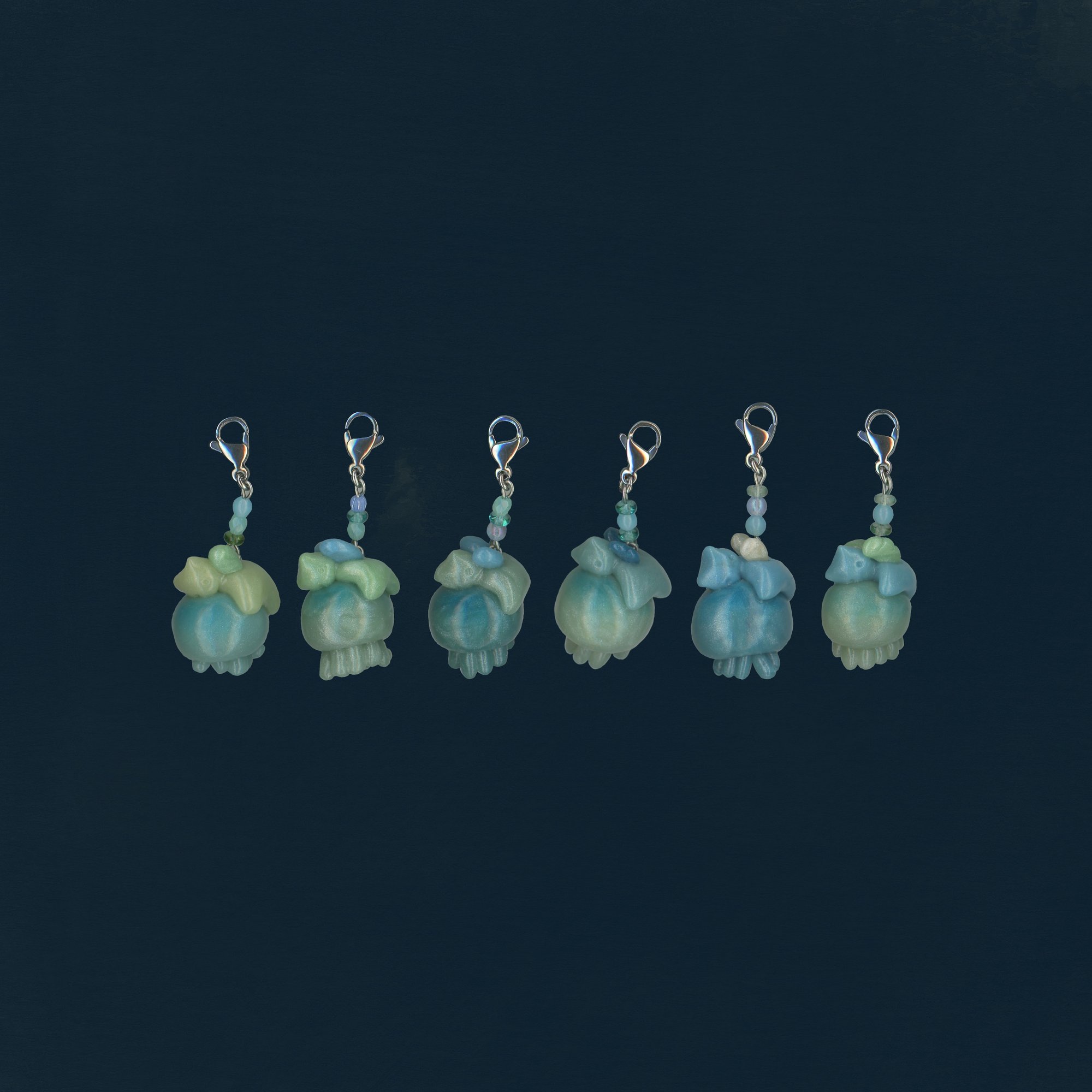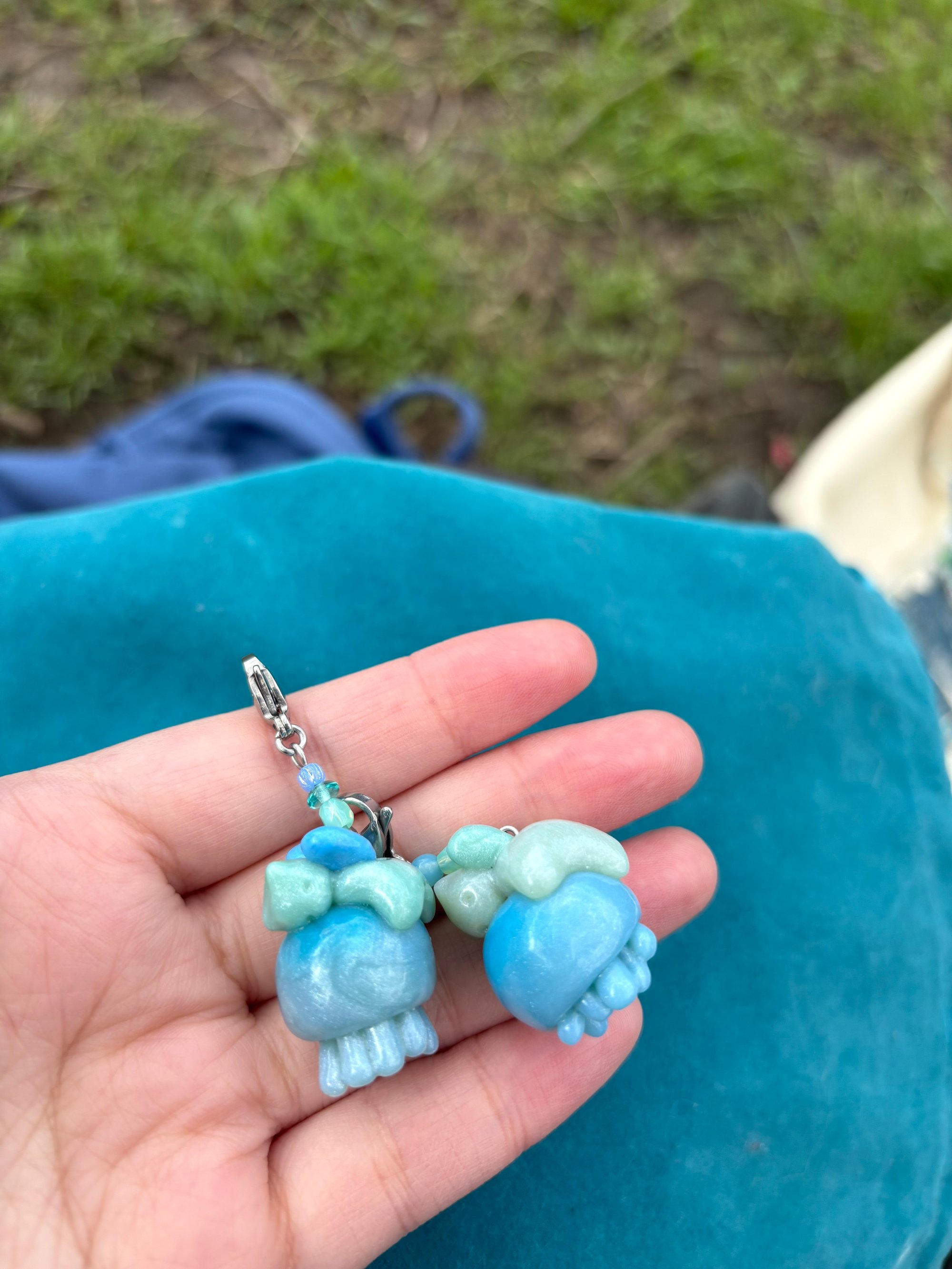 made with polymer clay, glass beads, plastic beads, stainless steel parts and glazed with a water based varnish