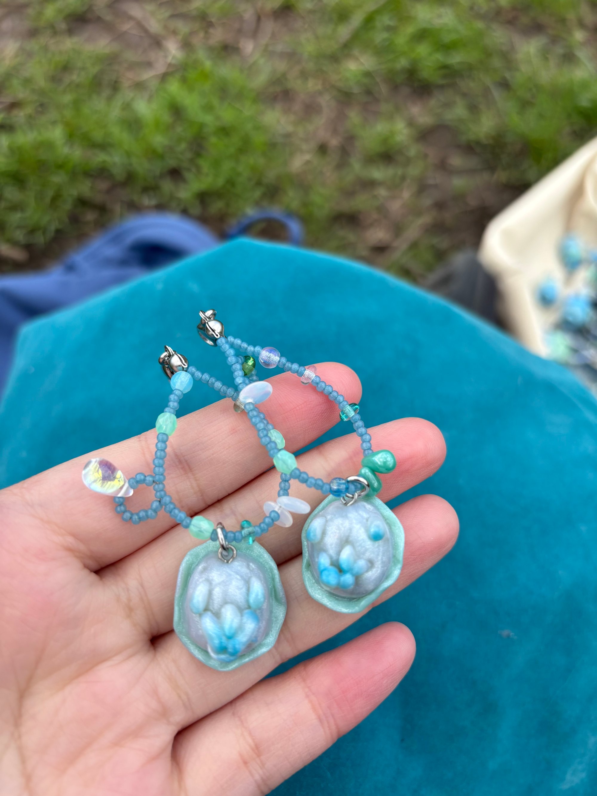 made with polymer clay, glass beads, plastic beads, stainless steel parts and glazed with a water based varnish