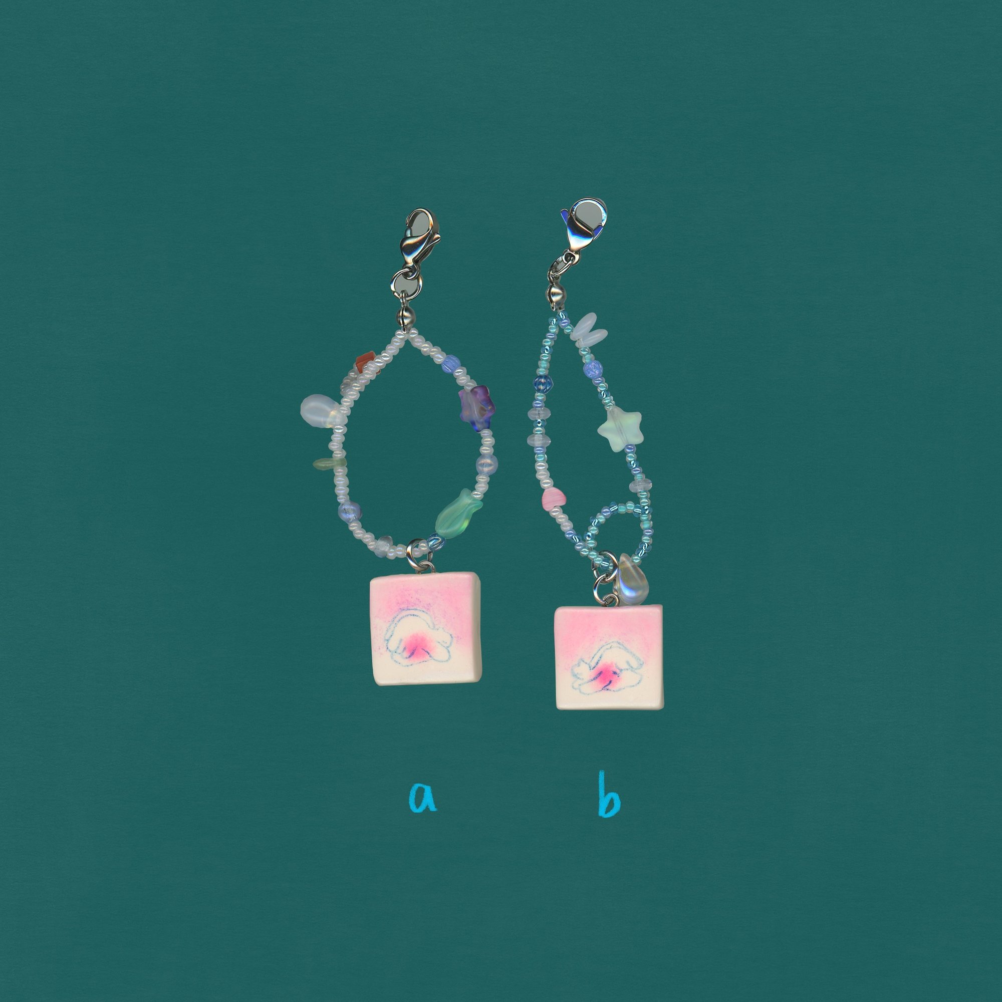All handmade with polymer clay, a mix of plastic / glass beads, stainless steel parts and glazed with a water based varnish